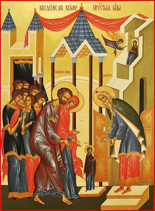 Введення у храм Пресвятої Богородиці є одним з дванадцяти головних свят церковного календаря. Згідно з Переданням, Пречиста Діва в трирічному віці була віддана батьками – праведними Іоакимом і Анною – до Єрусалимського храму. Пресвята Марія, не дивлячись на дитячій вік, самостійно піднялася сходами до храму, де первосвященик Захарія ввів її до Святая Святих.